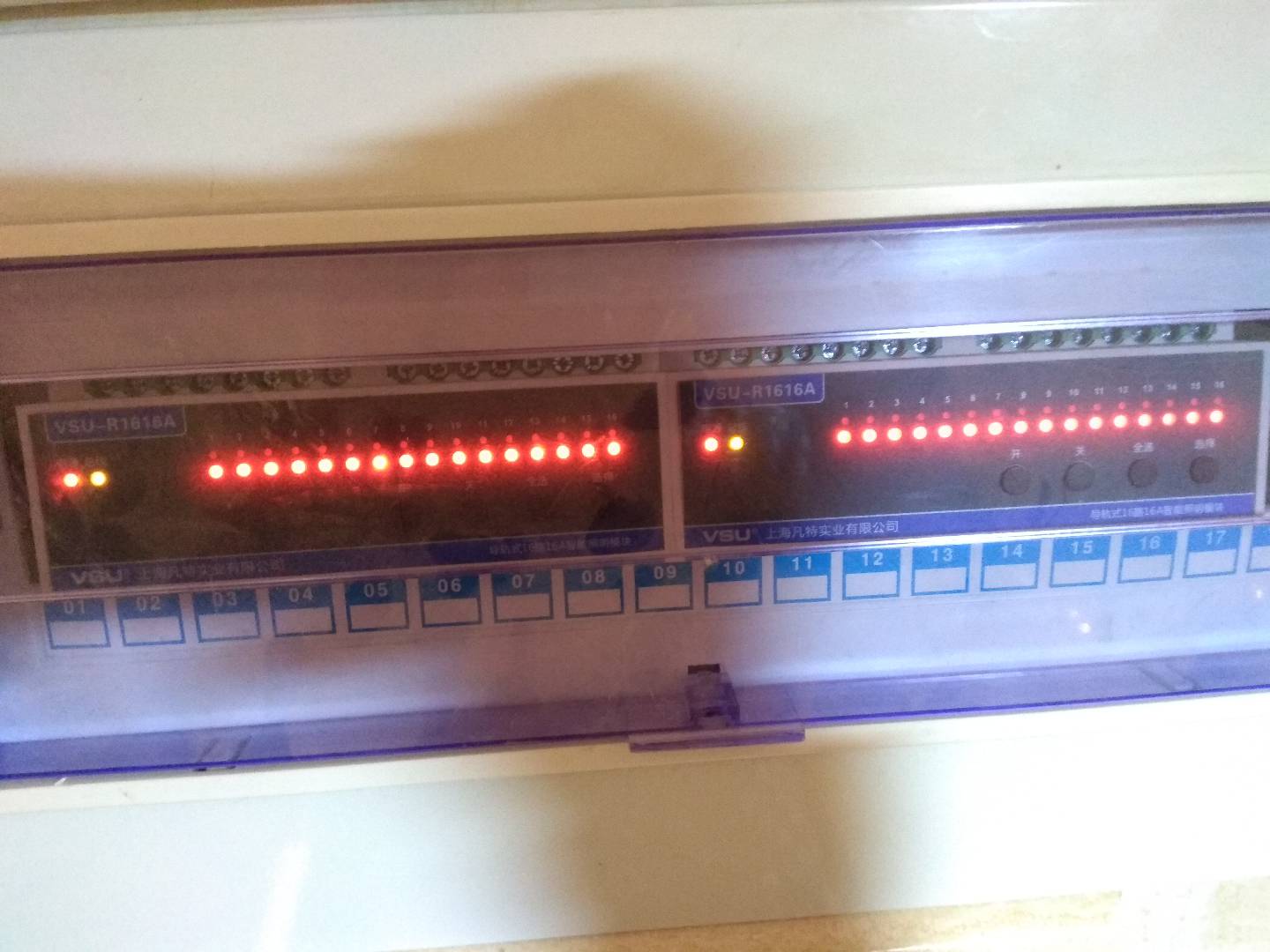 VSU智能照明控制系統(tǒng)實(shí)現(xiàn)對燈具的集中控制管理,依靠手機(jī)或者電腦平板就可以一鍵開閉所有燈具。項(xiàng)目采用的VSU照明設(shè)備有:16路16安智能照明模塊、網(wǎng)關(guān)主機(jī)、電源模塊、級(jí)聯(lián)模塊、連接片。
