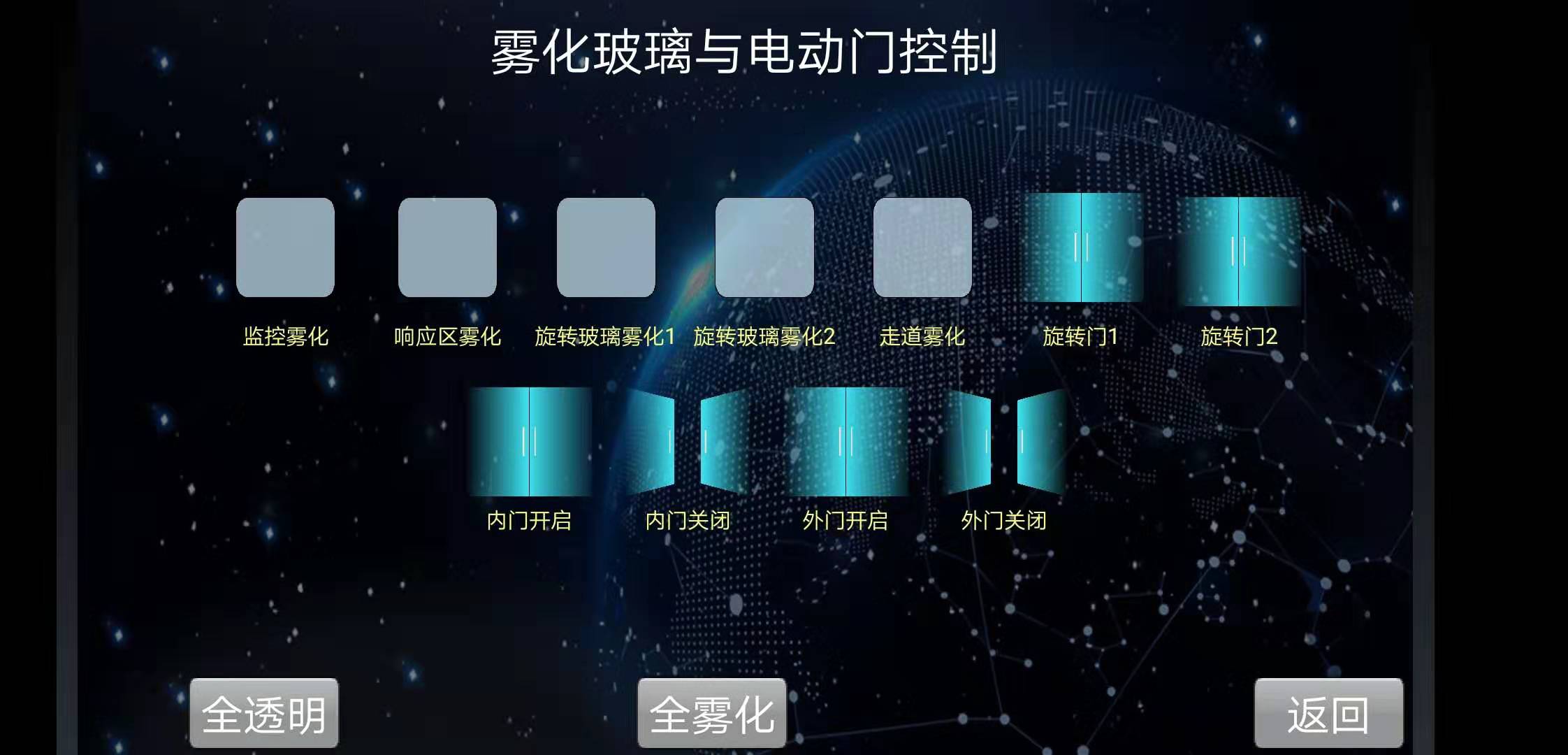 霧化玻璃與霧化玻璃門:調(diào)度中心有五組霧化玻璃,其中兩組為可旋轉霧化玻璃門。經(jīng)過技術對接以后,通過控制霧化玻璃的干接點信號,閉合則控制霧化玻璃門透明,斷開則控制霧化玻璃門霧化。旋轉門也同樣控制干接點信號,閉合則旋轉九十度,斷開則復原。
