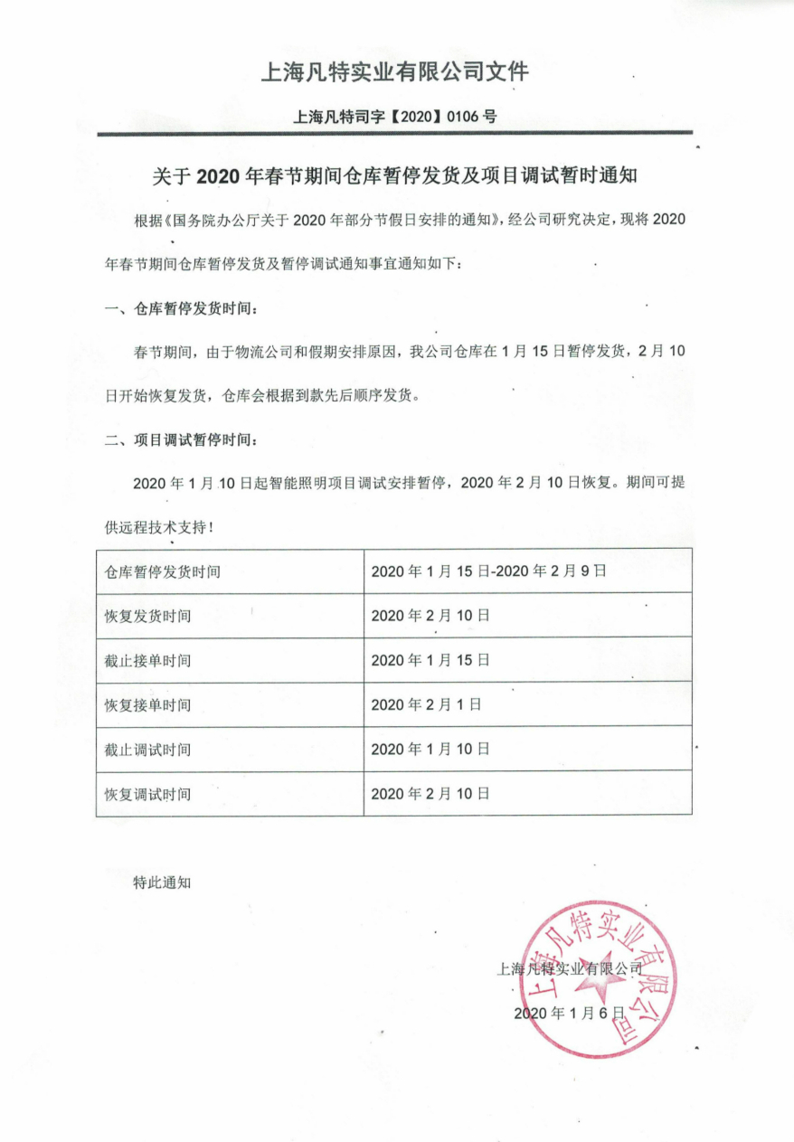 2020年春節(jié)期間暫停發(fā)貨、調(diào)試通知