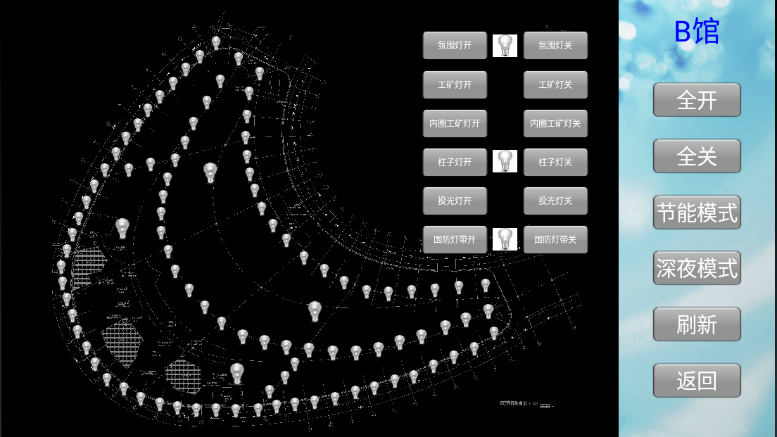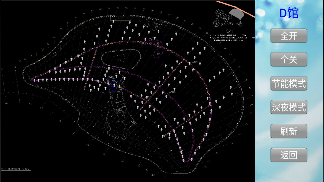 根據夏日晝長夜短、冬日晝短夜長的氣候特點以及開館、閉館的時間,預設燈光自動亮起、關閉的時間,避免忘關、漏關等現象;深夜客流量少時根據部分場館的需求可預設其所需的亮度(如下圖:深夜模式)