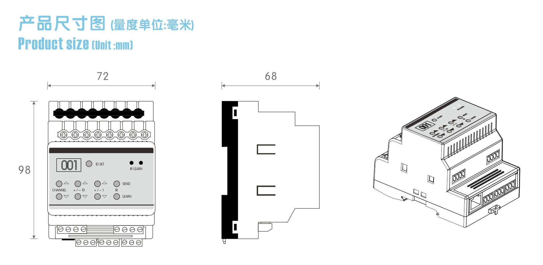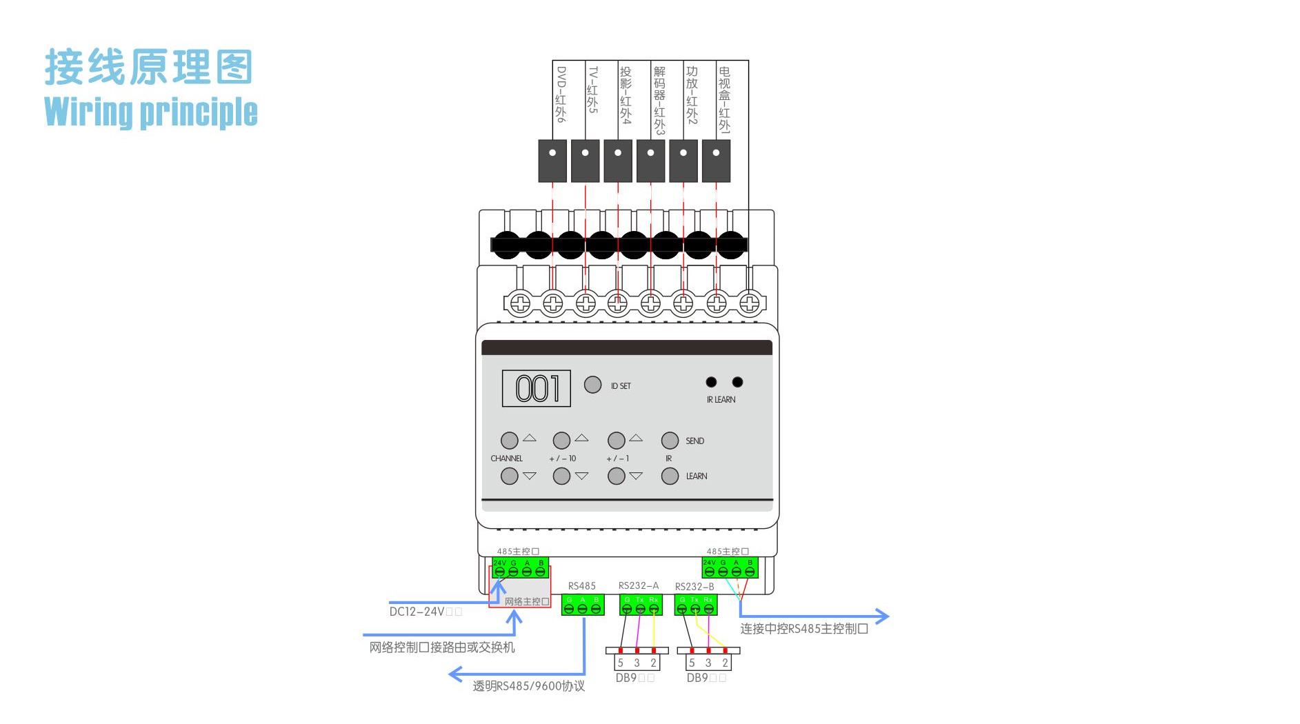 本產(chǎn)品為導(dǎo)軌式安裝,含6路紅外輸出,具備強(qiáng)大紅外能力及兼容性可控制6個紅外設(shè)備如電視、DVD、空調(diào)等,2路可編程串口控制投影機(jī)和矩陣等設(shè)備,具備強(qiáng)大紅外能力及兼容性; |