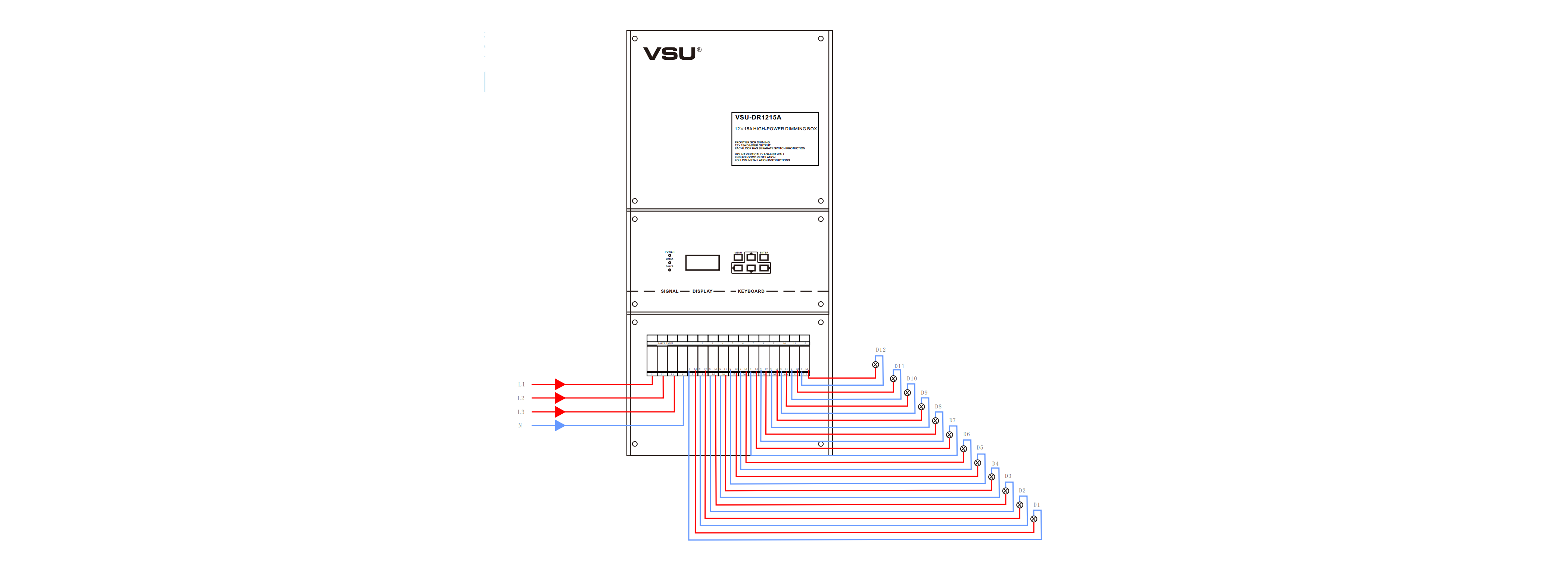本產(chǎn)品為掛壁式安裝,前沿可控硅調(diào)光;12組調(diào)光通道輸出,每通道3200W;輕巧型設(shè)計(jì)美觀大方。帶斷路器保護(hù);