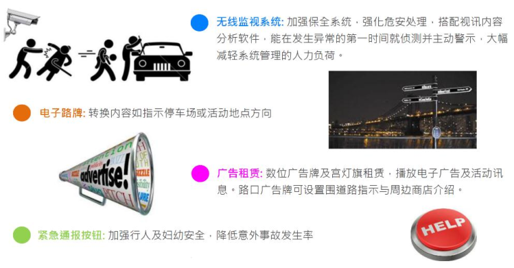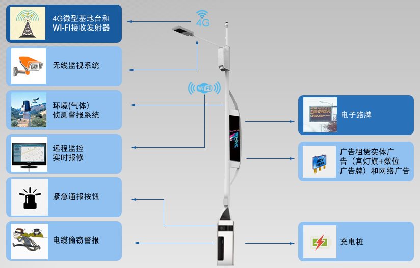 智慧路燈桿是一種集成各種信息設備技術創(chuàng)新復合應用的智慧路燈產(chǎn)品,整個智慧燈桿內包含路燈照明控制系統(tǒng)、WIFI天線基站、視頻監(jiān)控管理、廣告屏播控系統(tǒng)、城市環(huán)境實時監(jiān)測、緊急呼叫系統(tǒng)、水位監(jiān)測、充電樁系統(tǒng)和井蓋監(jiān)測系統(tǒng)等應用。